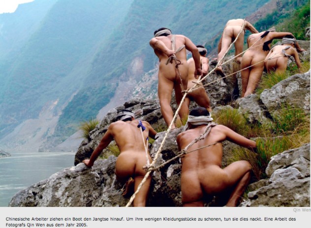 The practice (逆水行舟) is still very much alive in today's China (the picture of boatsmen hauling along rough terrain on the banks of Yangtse river (or ChangJiang) was taken in 2005).