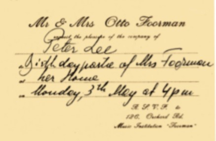 It wasn't Foreman, Foorman, where "oo" rhymes with "you", was originally Fuhrmann, a typical German name which was "Anglicized" after they came to S'pore. She told me how to pronounce it once, and was happy that I was the only one to remembered how to address her correctly, since all the others called her Mrs. "Foreman". Below: left, a signed photo; right, an invitation to her birthday party (which she misspelled "partie"). I have another invitation to a party for a group of younger students (she called them "student's afternoon"). She used have me sit right next to her and tell stories during such parties, e.g., how she survived the concentration camp, lived in a DP (displaced person) camp right after the war, and how she came to S'pore. The emphasis was always on her piano playing that got her through some incredibly tough situations. This was shortly after the war, and the ordeal must have still been very fresh in her mind; in retrospect, telling it often must have been therapy.