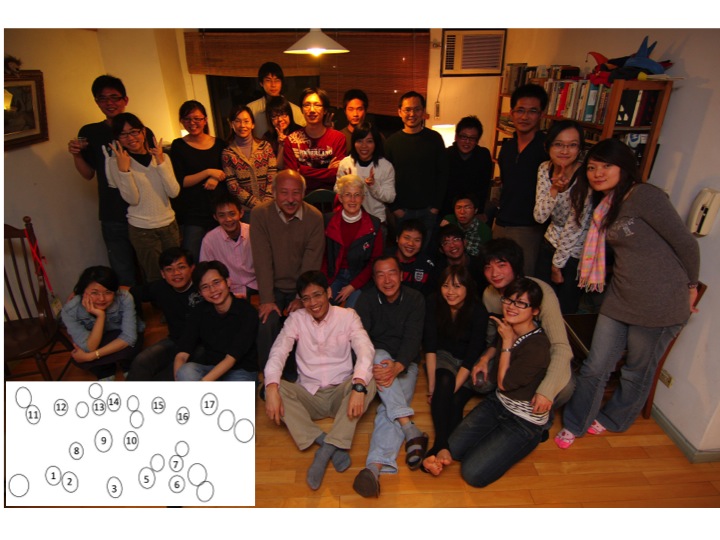 1. Sing-Guan Kong, 2. Hong-Da Chen, 3. Dr. Chih-How Chen, 5. HCL, 6. Yi-An Ko, 7. Feng-Hsiang Chung, 8. Li-Hsing Young, 9. ??? (visiting historian), 10. Prof. Lynn Struve (visiting from U. Indiana), 11. Tzu-Ting Hsu, 12. Xiao-Rong Chen, 13. Ya-Hsin Tien, 14. Chue-Lin Hsu, 15. Prof. Chien-Sheng Chen, 16. Zhu-You Cheng, 17. Chun-Ping You.
