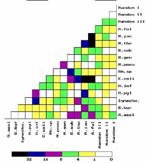 Thirteen Bacterial Complete Genomes and Phylogeny A global comparison of the thirteen complete bactrial genomes available from the GenBank to May of 1998 is made by studying genome-genome correlations of distributions of frequency of occurrence of oligonucleotides (6-mers and 7-mers, respectively) tagged by under-represented palindromes (4-mers and 5-mers respectively) that are mostly recognition sites of bacterial restriction enzymes. Whereas frequency distributions of untagged oligonucleotides have little species dependence and correlations of such distributions show no structure, frequency distributions of the tagged oligonucleotides are strongly species dependent, and correlations of such distributions are highly structured and seem to yield useful phylogenetic information. In particular, correlations between species distant on the rRNA phylogenetic tree are observed, several of which corroborate results of recent analyses of gene homology suggesting the frequent occurrence of lateral gene transfer between species. | ![]() |